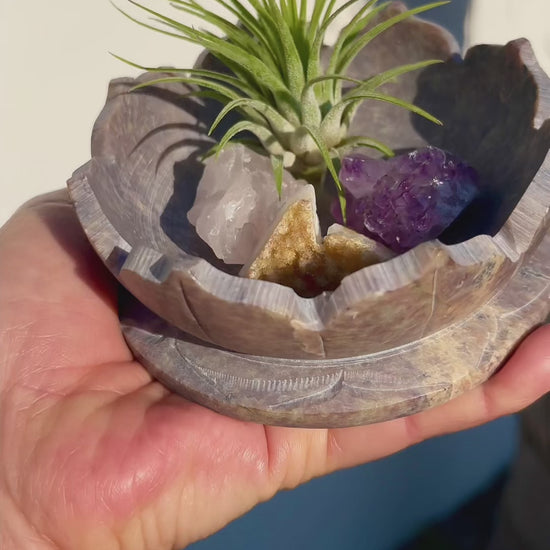 Sympathy Gift - Lotus Carved Marble Decorative Bowl Air Plant Display with Crystals, Includes Air Plant, Amethyst, Citrine, Rose Quartz