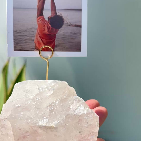Whether you're looking to elevate your desk decor or find a meaningful gift, this clear quartz photo holder blends raw geological beauty with everyday functionality.